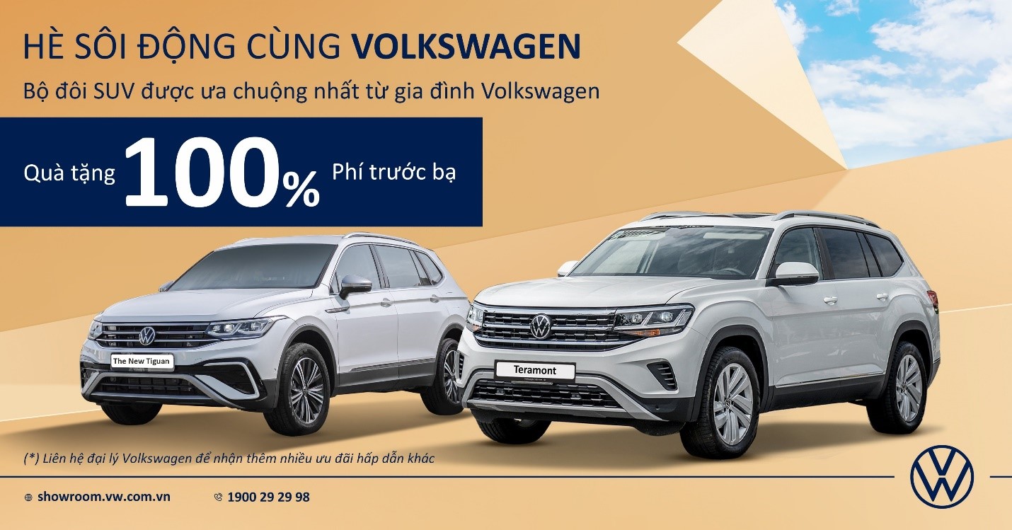Chương trình ưu đãi hè của Volkswagen Việt Nam mạnh tay áp dụng 100% phí trước bạ cho hai mẫu SUV 7 chỗ chủ lực về doanh số của hãng Đức là Tiguan và Teramont. Chương trình diễn ra trong tháng 6, nhằm hỗ trợ khách hàng tối đa trong giai đoạn thị trường khó khăn hiện nay.